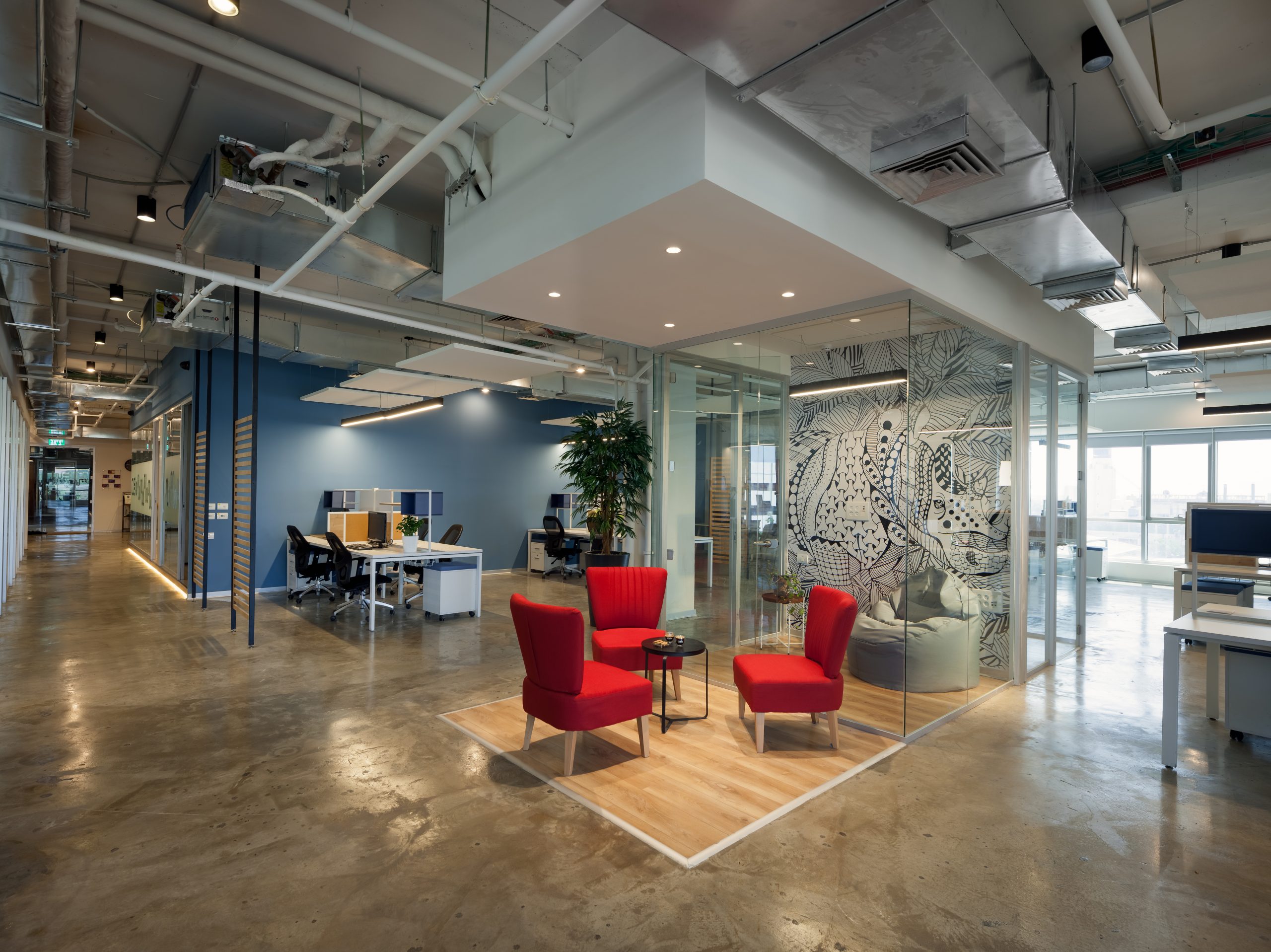 ציורי קיר במרחב, מוסיפים לחוויית הריגוש ולעניין הוויזואלי. המחקרים מראים שציור קיר מתאים ודינמי יגביר את רמת האנרגטיות בסביבת העבודה ויתרום ליצירתיות ולפרודוקטיביות של הצוות