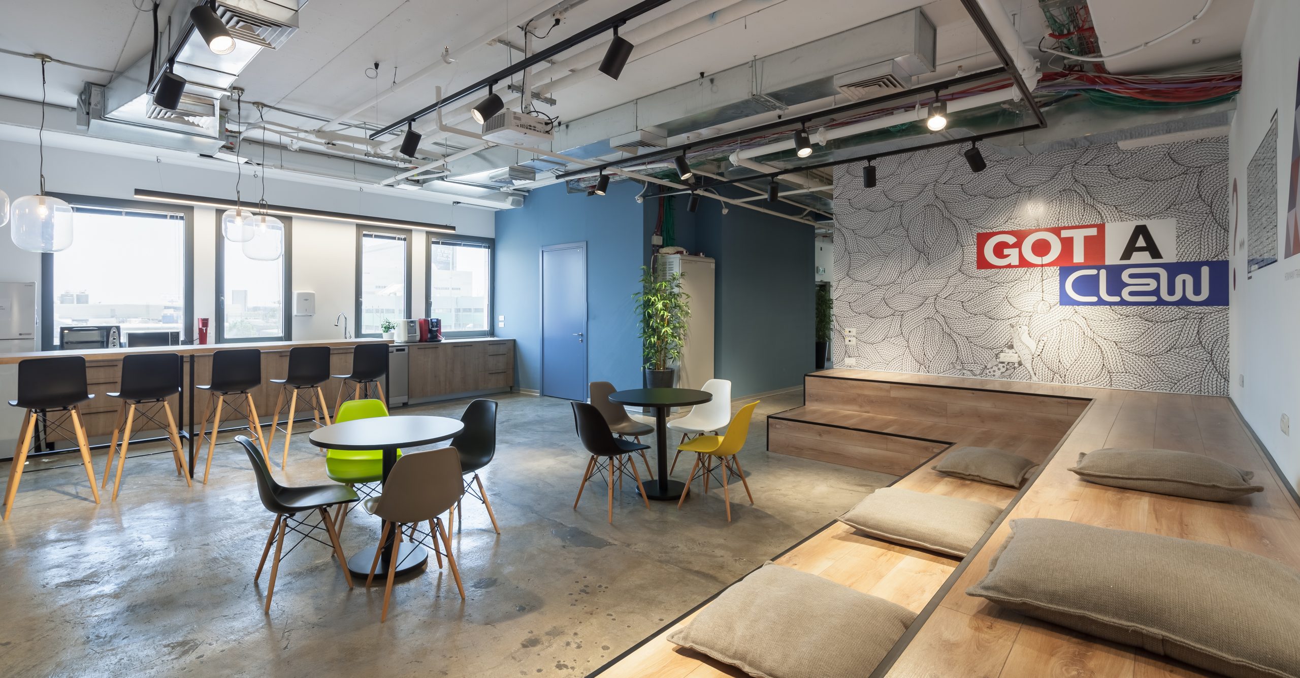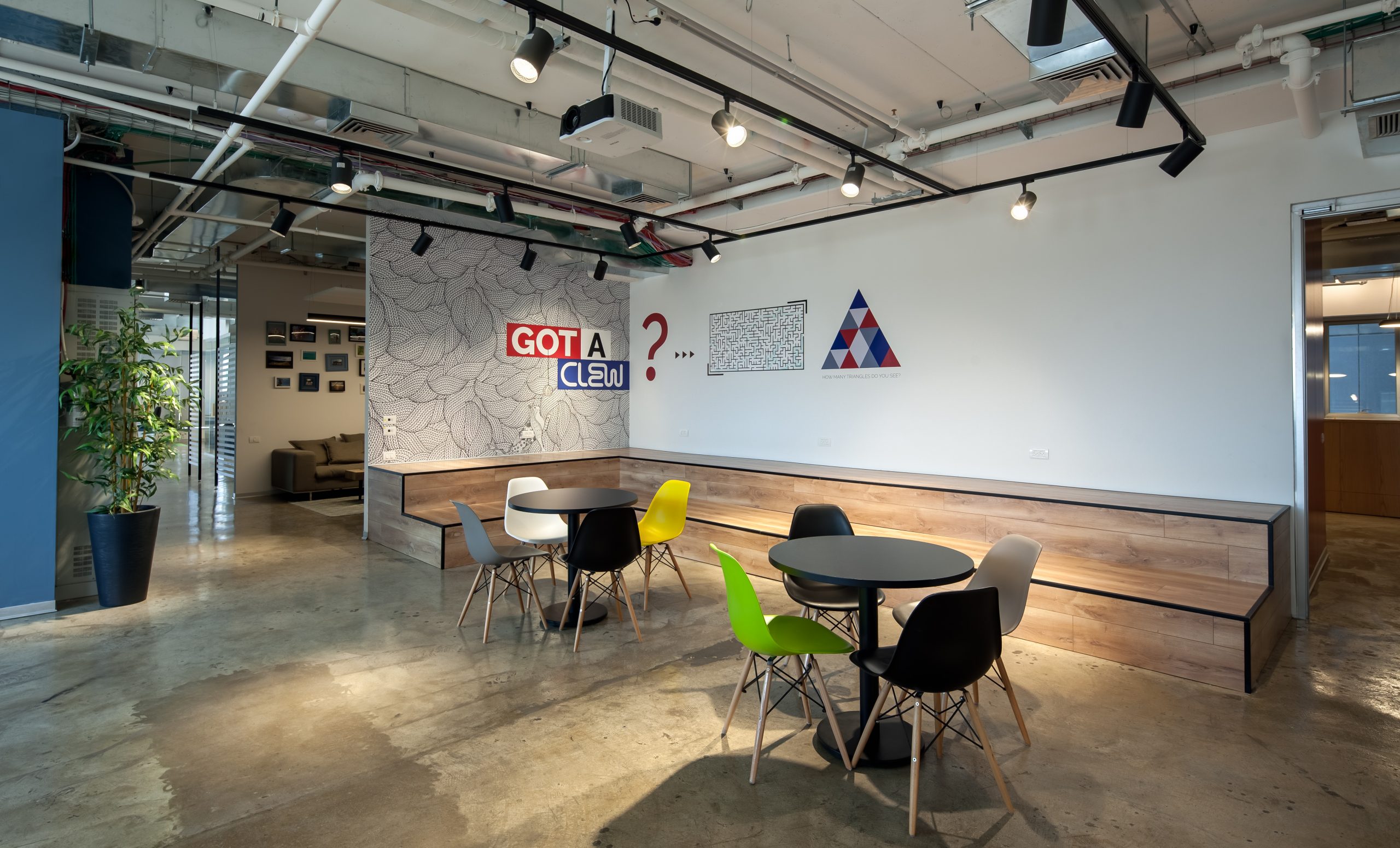 בפרויקט תכנון סביבת העבודה עבור CLEW לקוח מוביל בעולם המחקר והפיתוח הרפואי (מדיטק) נתבקשנו לעצב חלל משרדי בהיקף של כ 650 מ”ר. קיבלנו את הקומה במצב מעטפת, והתכנית של הסטודיו כללה עלפי הפרוגרמה, אזור קבלת פנים בלובי הכניסה, אזור עבודה משותף שכולל חדרי זום, חדר ישיבות גדול שמתפצל לשניים קטנים, מקלחת ושירותים. בחלל תוכננו 4 אזורי מפגש א-פורמליים, לסיעור מוחות, למפגשי שיתוף ידע, קפיטריה רב שימושית, להדרכות והרצאות, מפגשי עבודה, למנוחה, לאוכל ושתיה. התכנית הרעיונית כללה מראש הקצאת קירות לציורי קיר ומיתוג .